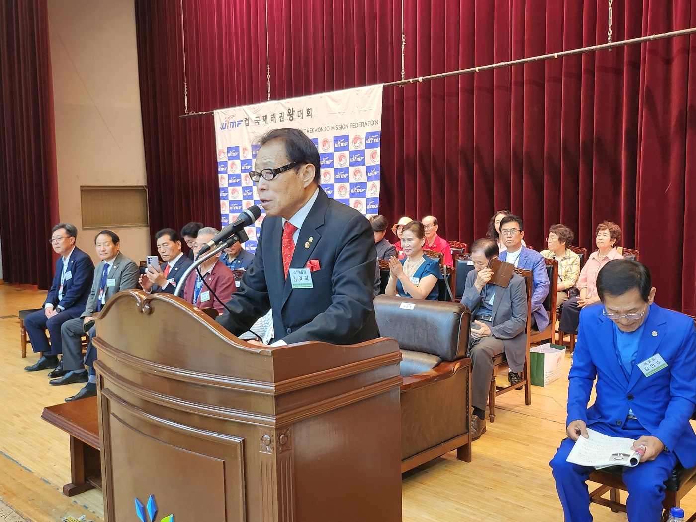 🔼김경덕 세계태권도선교연맹 고문이 '제20회 WTMF컵 국제태권왕대회' 개회식에서 격려사를 하고 있다.