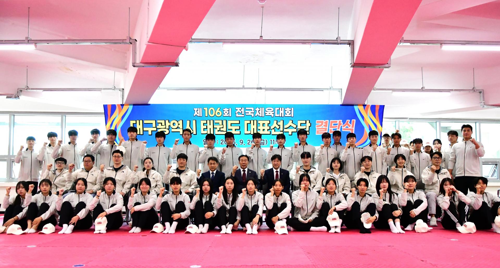 [세계태권도무예신문] 대구광역시태권도협회(회장 안종수)는 지난 9월 26일(일) 오전 10시 30분 대구체육관 태권도 전용훈련장에서 오는 10월 14일(화)부터 19일(일)까지 부산광역시 강서체육관에서 사전 경기로 열리는 ‘제106회 전국체육대회(태권도)’ 경기에 출전할 대표선수단 출정식’을 개최하고 필승의 의지를 다졌다.
