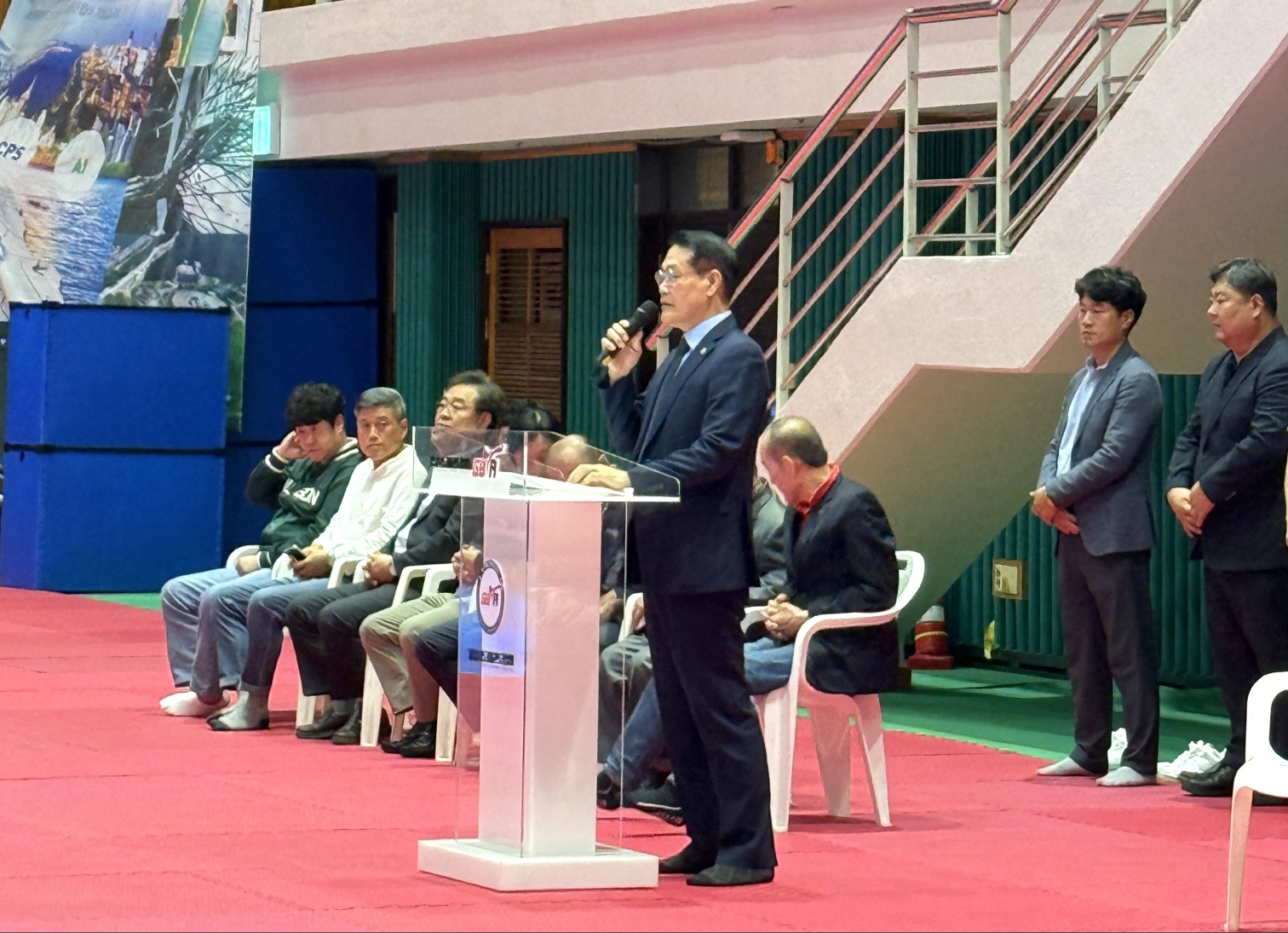 🔼이성우 경상북도태권도협회장이 ‘제106회 전국체육대회(태권도)’ 출정식에서 인사말을 하고 있다.