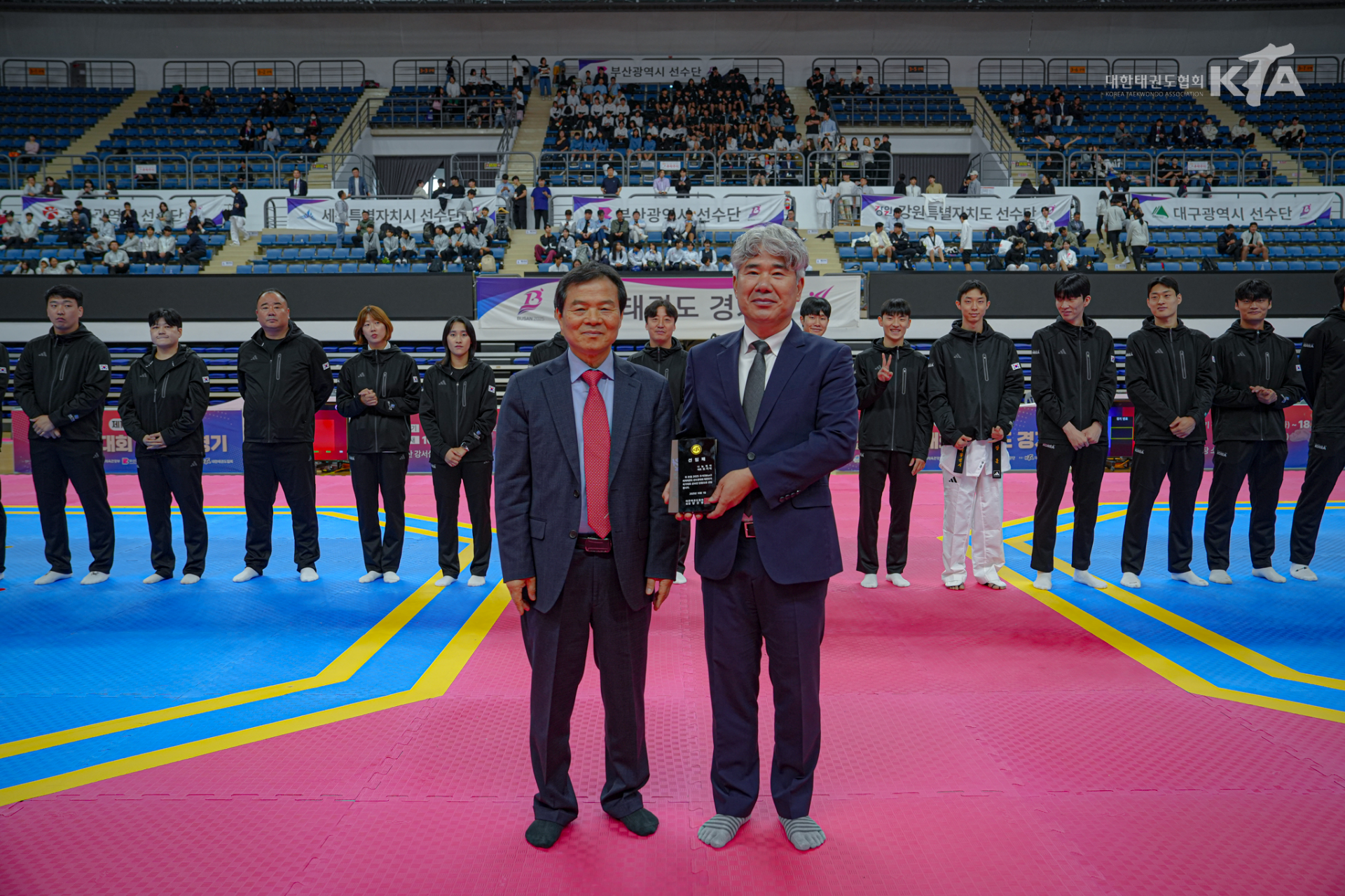 🔼양진방 대한태권도협회장(좌측)이 도기식 단장에게 단장 선임패를 전달하고 있다. [사진=대한태권도협회]