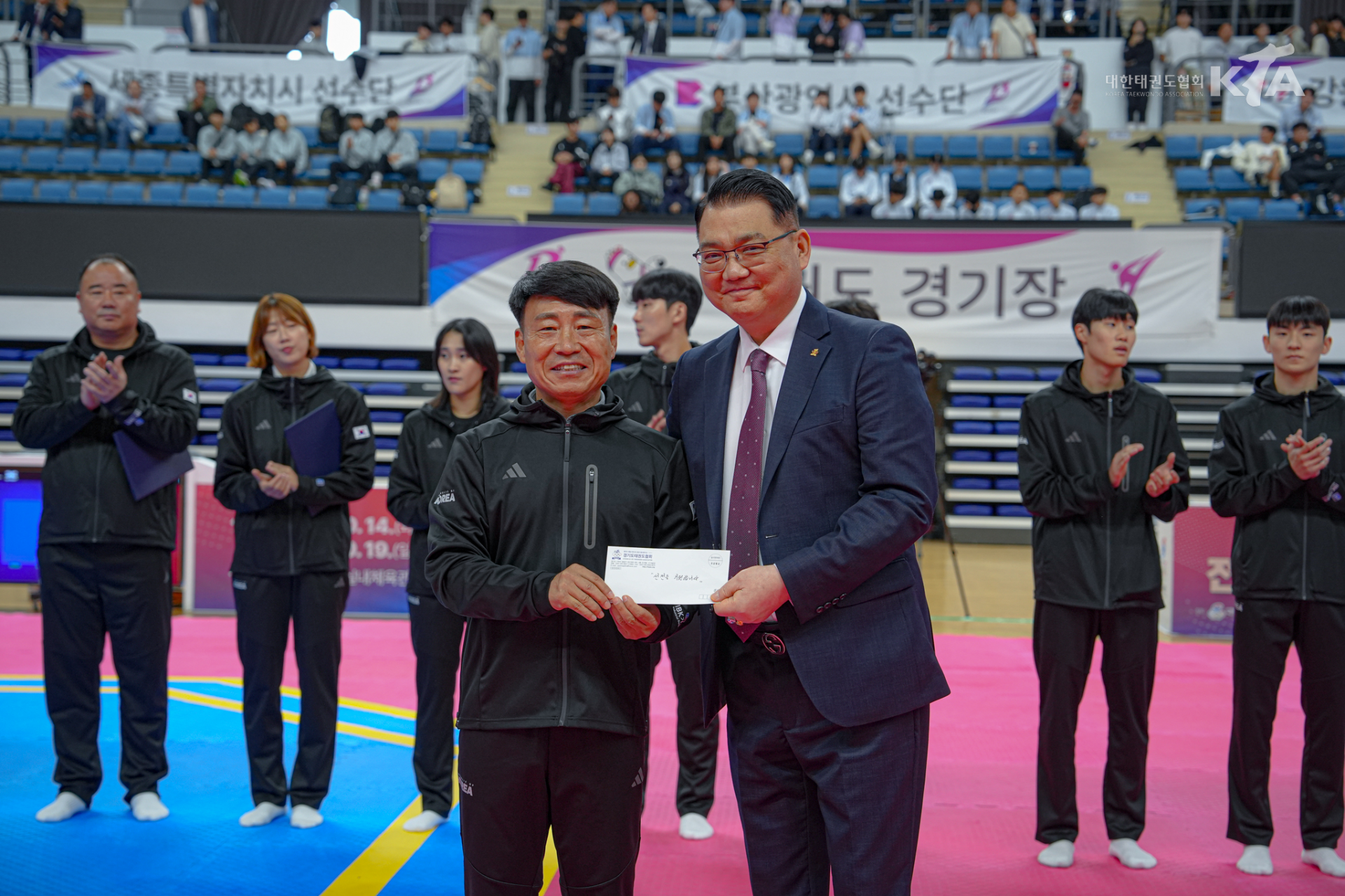 🔼김평 경기도태권도협회장(우측)이 이승행 여자부 감독에게 격려금을 전달하고 있다. [사진=대한태권도협회]