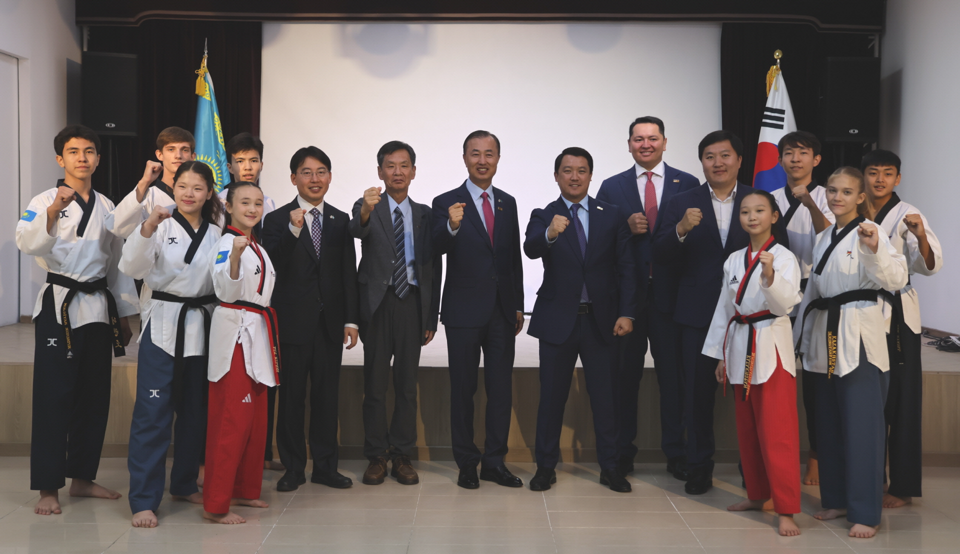 🔼오른쪽부터 카자흐스탄 청소년 태권도시범단(도복입은 4명), 예브게니 최 아스타나 고려인협회장, 아이잣 카자흐스탄 태권도협회 부회장, 아랄 카자흐스탄 태권도협회 사무총장, 조태익 주카자흐스탄 대사, 정상기 국립태권도박물관장, 구본철 주카자흐스탄 한국문화원장, 카자흐스탄 청소년 태권도시범단(도복입은 5명) 순. [사진=태권도진흥재단]