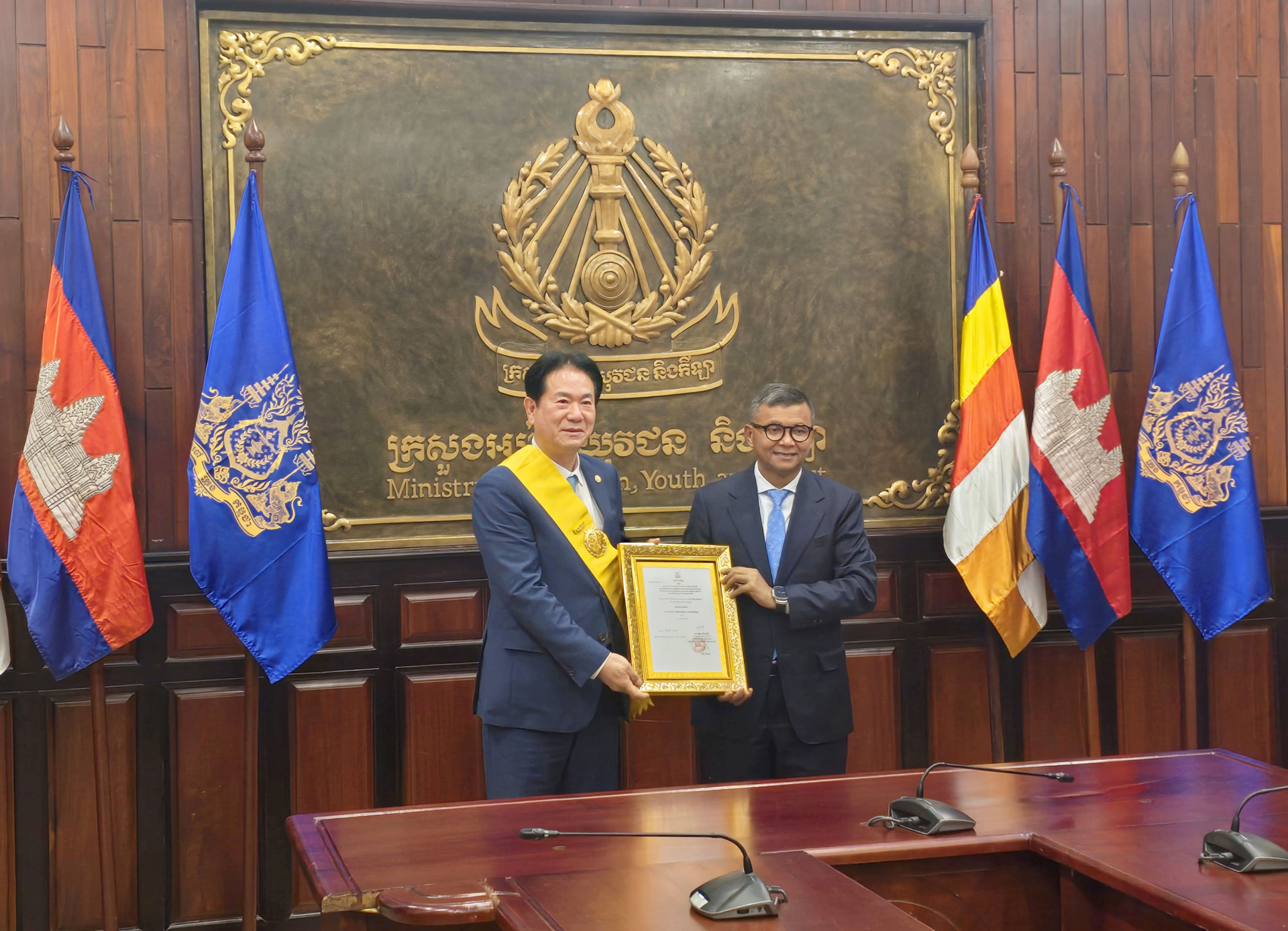 이날 수여식에는 항추온 나론(HANGCHUON NARON) 교육청소년체육부 장관 겸 캄보디아태권도협회 회장이 이동섭 원장에게 훈장을 대리 수여했다.
